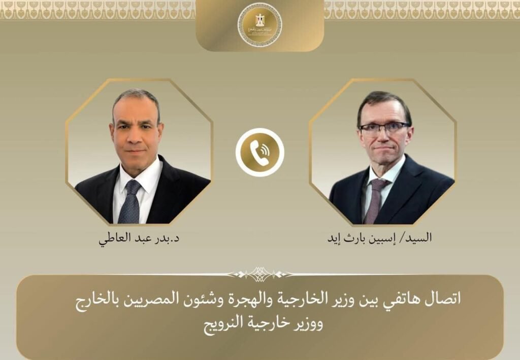 جرى اتصال هاتفي بين د. بدر عبد العاطي وزير الخارجية والهجرة وشئون المصريين بالخارج والسيد “إسبين بارث إيد” وزير خارجية النرويج يوم السبت ٢٧ ديسمبر ٢٠٢٥، لتناول مستجدات التطورات الإقليمية.
