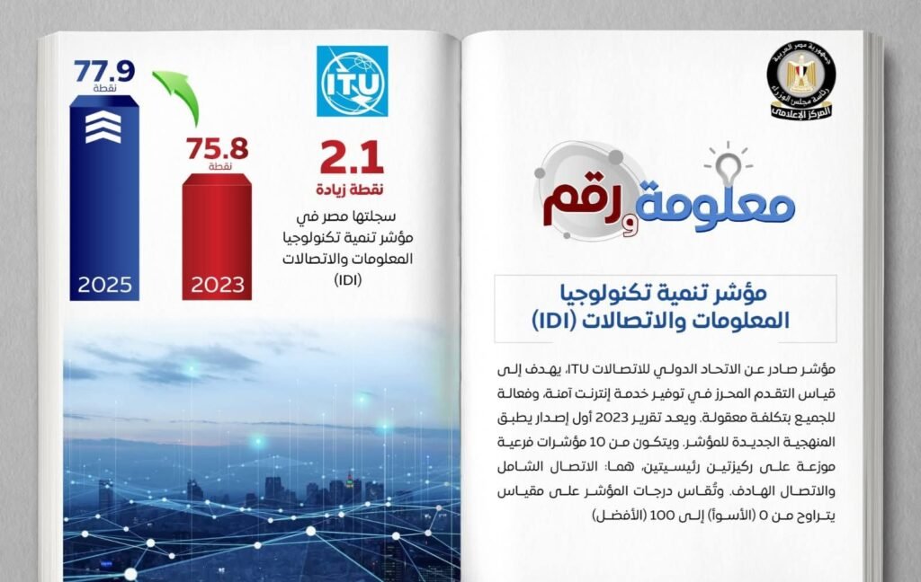 حققت مصر زيادة قدرها 2.1 نقطة في مؤشر تنمية تكنولوجيا المعلومات والاتصالات الصادر عن الاتحاد الدولي للاتصالات، لترتفع من 75.8 نقطة في عام 2023 إلى 77.9 نقطة في عام 2025. يأتي هذا التحسن بفضل الجهود التي بذلتها الدولة لتحسين خدمات الاتصالات،