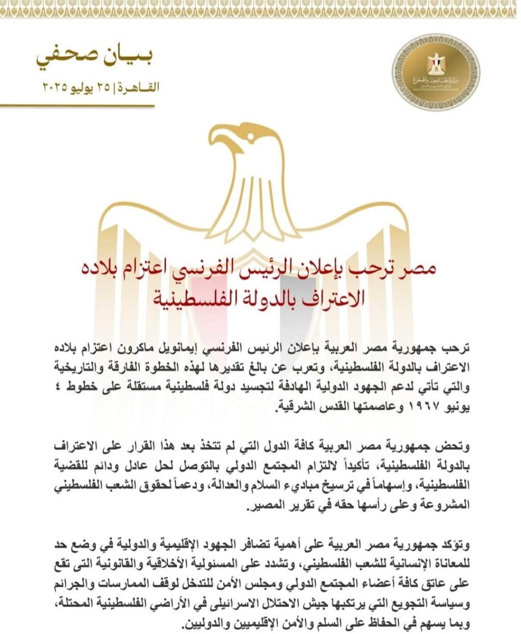 سحر الشريف ترحب جمهورية مصر العربية بإعلان الرئيس الفرنسي إيمانويل ماكرون اعتزام بلاده الاعتراف بالدولة...