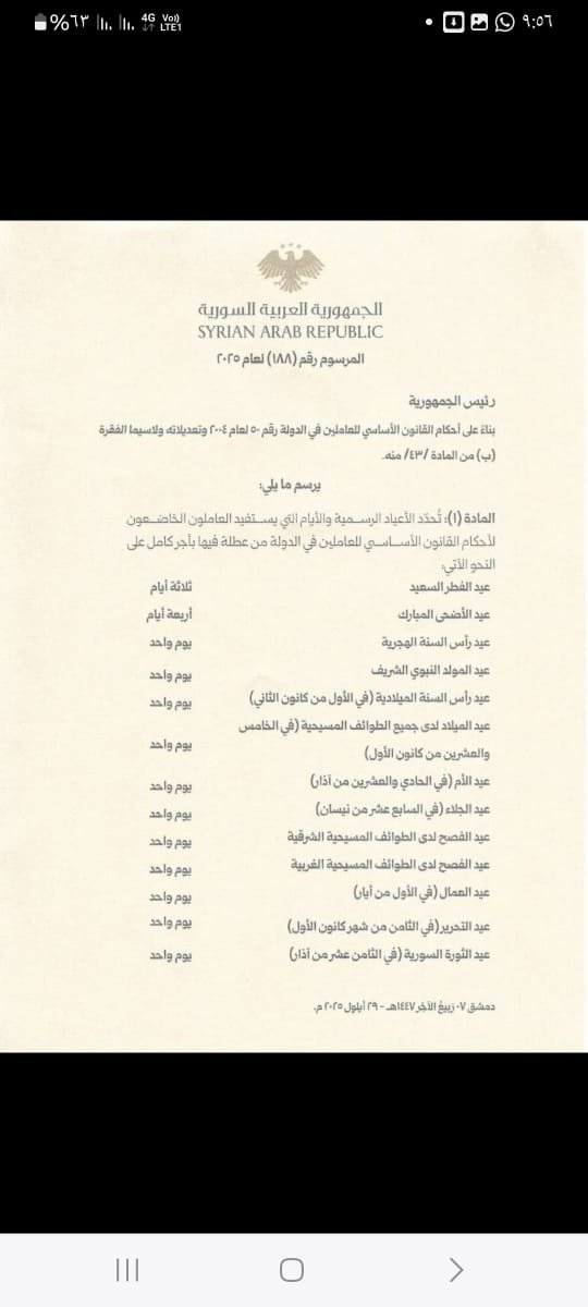 كتب / مصطفى احمد أصدر الرئيس الانتقالى السورى احمد الشرع مرسوم بالعطلات لموظفي الدولة...