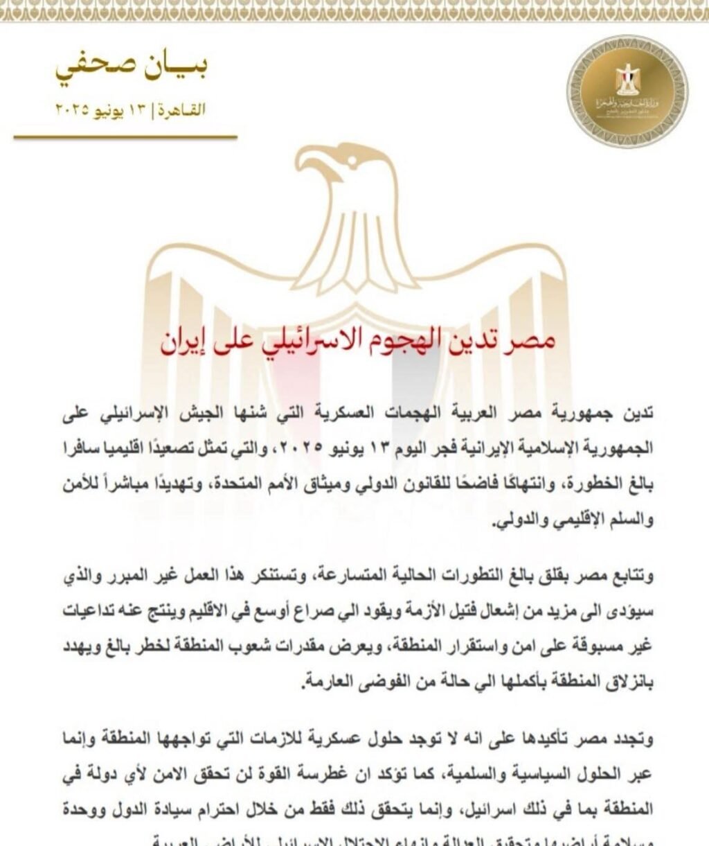 سحر الشريف تدين جمهورية مصر العربية الهجمات العسكرية التي شنها الجيش الإسرائيلي على الجمهورية الإسلامية الإيرانية...